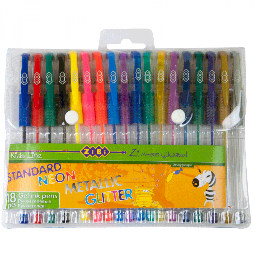 Набор из 18 гелевых ручек с 4 видами чернил в пластиковом пенале с завесом на 2 кнопках: 4 ручки стандартных цветов (синий, красный, зеленый, черный); 4 ручки неоновых оттенков с флуоресцентными пигментами (желтый, розовый, красный, голубой); 4 ручки с блестками (фиолетовый, синий, зеленый, золотой); 6 ручек с металлическими пигментами (зеленый, синий, серебрянный, золотой, фиолетовый, красный). Толщина линии письма 0.7 мм. Корпус: круглый, длиной 140 мм. Металлизированный наконечник. Сменный стержень длиной 107 мм. Эргономичный прорезиненный рельефный грип предпреждает скольжение пальцев при письме и обеспечивает максимально комфортный захват. Стойкое и гладкое чернило, плавно наносится, не вигорает со временем. Упаковка – пластиковый пенал с европодвесом.