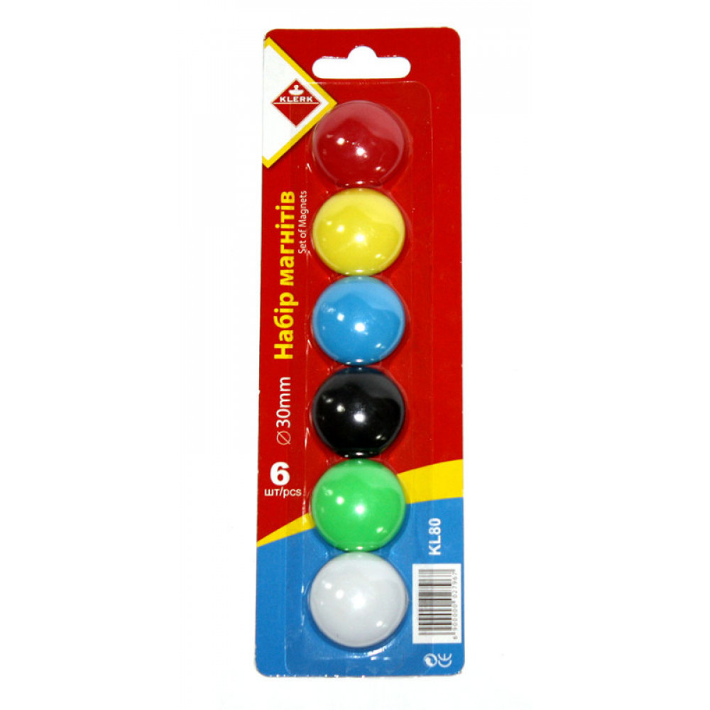 Магниты для доски Klerk. Надежно зафиксирую Вашу информацию на металлических поверхностях! Идеально подходят для офиса, школы, дома. Магниты используются для фиксации информации на гладких металлических поверхностях, прежде всего сухостираемых досок и флипчартов. Их используют для визуальной коммуникации в процессе презентаций, встреч, обучений, когда на доске нужно закрепить печатный материал. Диаметр - 3 см. Набор из 6 штук разных цветов.