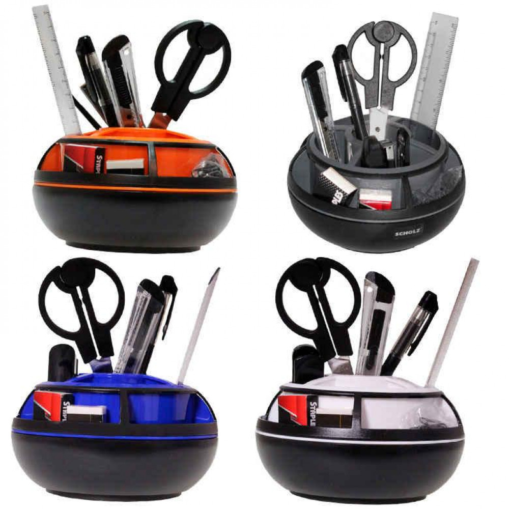 Настольный набор Scholz это самый простой, быстрый и удобный способ организации рабочего места. Набор изготовлен из полистирола премиального качества. Набор состоит из 9 предметов. В набор входит: подставка - вертушка, степлер № 10, скобы № 10 (1000 шт), ножницы: 15 см, нож канцелярский: 9 мм, линейка: 15 см, ручка шариковая, ластик, скрепки.