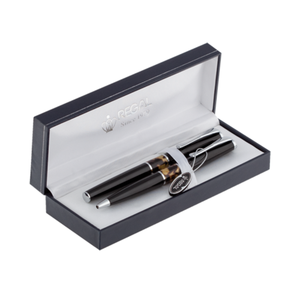 Перьевая и шариковая ручки. Подарочный футляр. Глянцевый лакированный корпус черного цвета. Декоративная акриловая вставка, имитирующая натуральный камень. Хромированные детали.