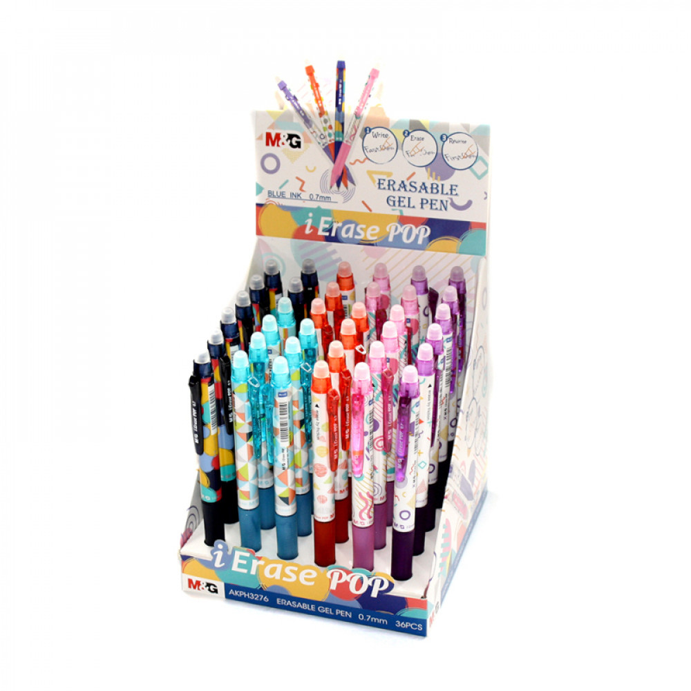 Если Вам нужна яркая ручка Пиши-Стирай, купить ее можно в серии Pop от производителя M&G. Она представлена в пяти вариантах дизайна: каждый выполнен в привлекательных оттенках и с интересными рисунками. Ручка гелевая Пиши-Стирай M&G имеет уникальное чернило синего цвета. Оно становится прозрачным под действием тепла, появляется вследствие трения резинкой листа бумаги. Резинка находится на кончике автоматической ручки. Если нужно незаметно сделать исправления, такие письменные принадлежности будут полезными. Ручка Пиши-Стирай M&G не имеет колпачка, но стержень скрывается внутри корпуса, предотвращает загрязнение рук, тетрадей или одежды. Удобная форма в зоне охвата обеспечивает мягкое письмо, рука не устает. На корпусе предусмотрен держатель для закрепления ручки на тетради или на учебнике. Пишущий узел имеет диаметр 0,7 мм. Преимущества ручек Пиши-Стирай ТМ M&G: длина линии до 350 м, пишущий узел швейцарского производства SWISS PREMEC. Собственное производство чернил по запатентованной технологии. Корпус ручек изготовлен из РММА пластика который является легким и устойчивым к механическим повреждениям. Резинка для стирания изготовлена из натурального каучука. Современный и привлекательный дизайн ручек разработан для школьников разных возрастных групп.