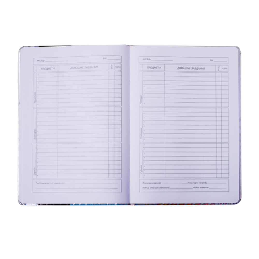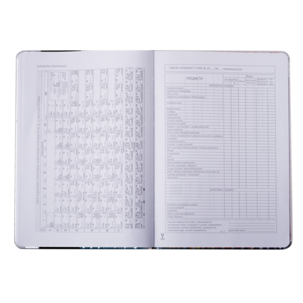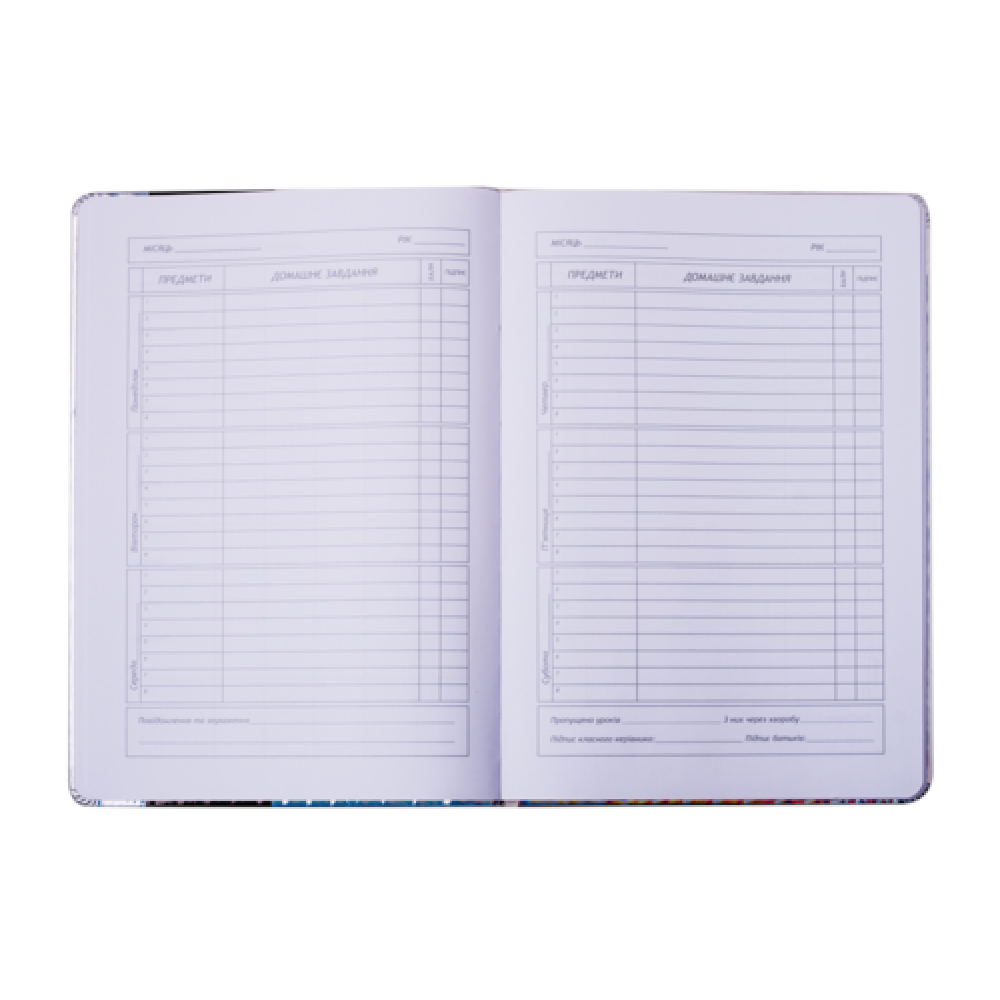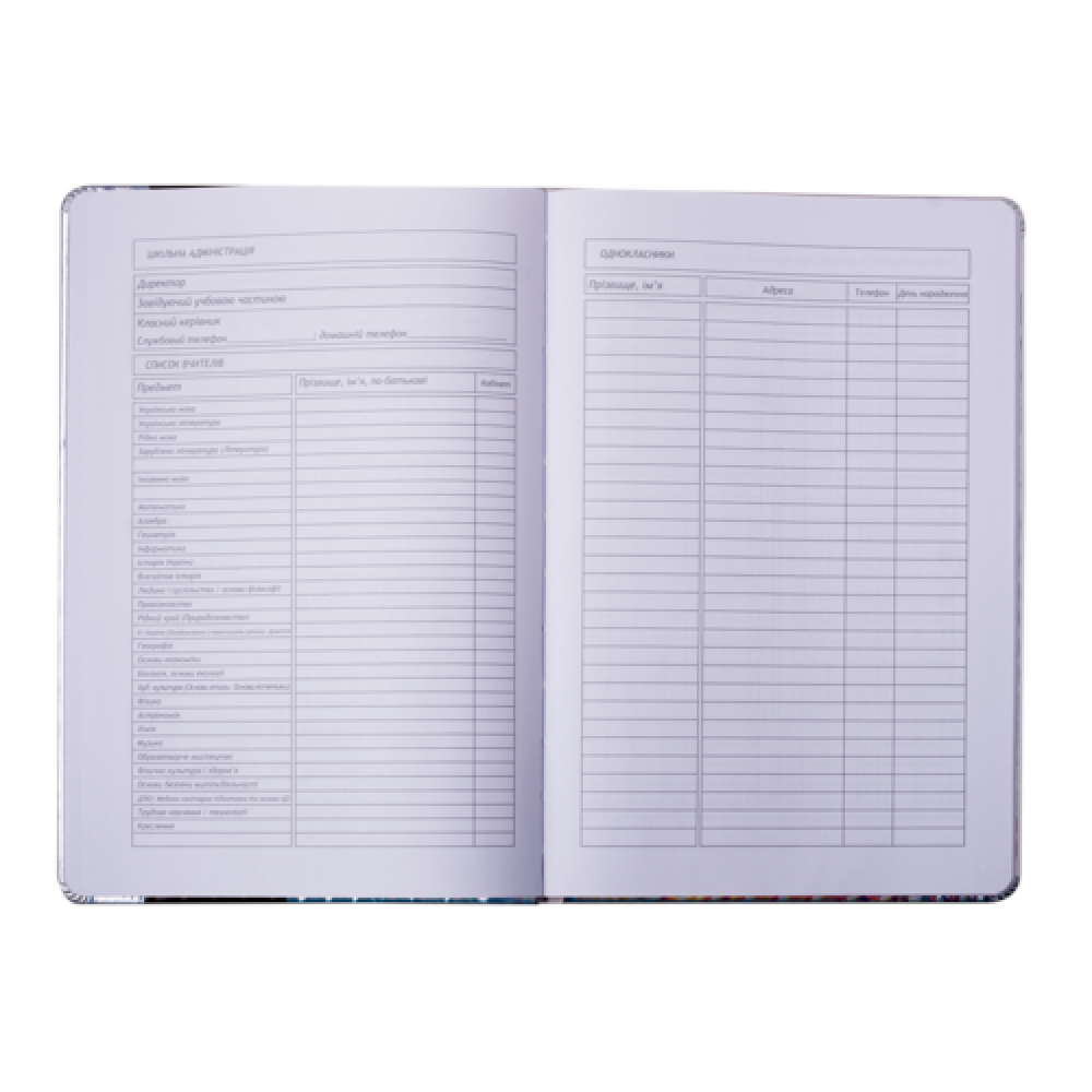 Формат B5. Кількість аркушів 48. Обкладинка з штучн. PU-шкіри, з поролоном. Декор - нашивка з штучн.шкіри, ніжки котика рухаються, будучи прикріпленими металевими заклепками, друк на лицьовій і зворотній стороні обкладинки: шовкографія. Дизайнерське оформлення форзаців за мотивами дизайну обкладинки. Внутрішній блок - білі аркуші, офсет, 70 г/м2. Зміст блоку - сторінки для персональних даних, інформації про вчителів, розкладу на семестри, табель успішності, розклад на тиждень (6 днів), довідкова інформація з основними формулами з різних предметів.
