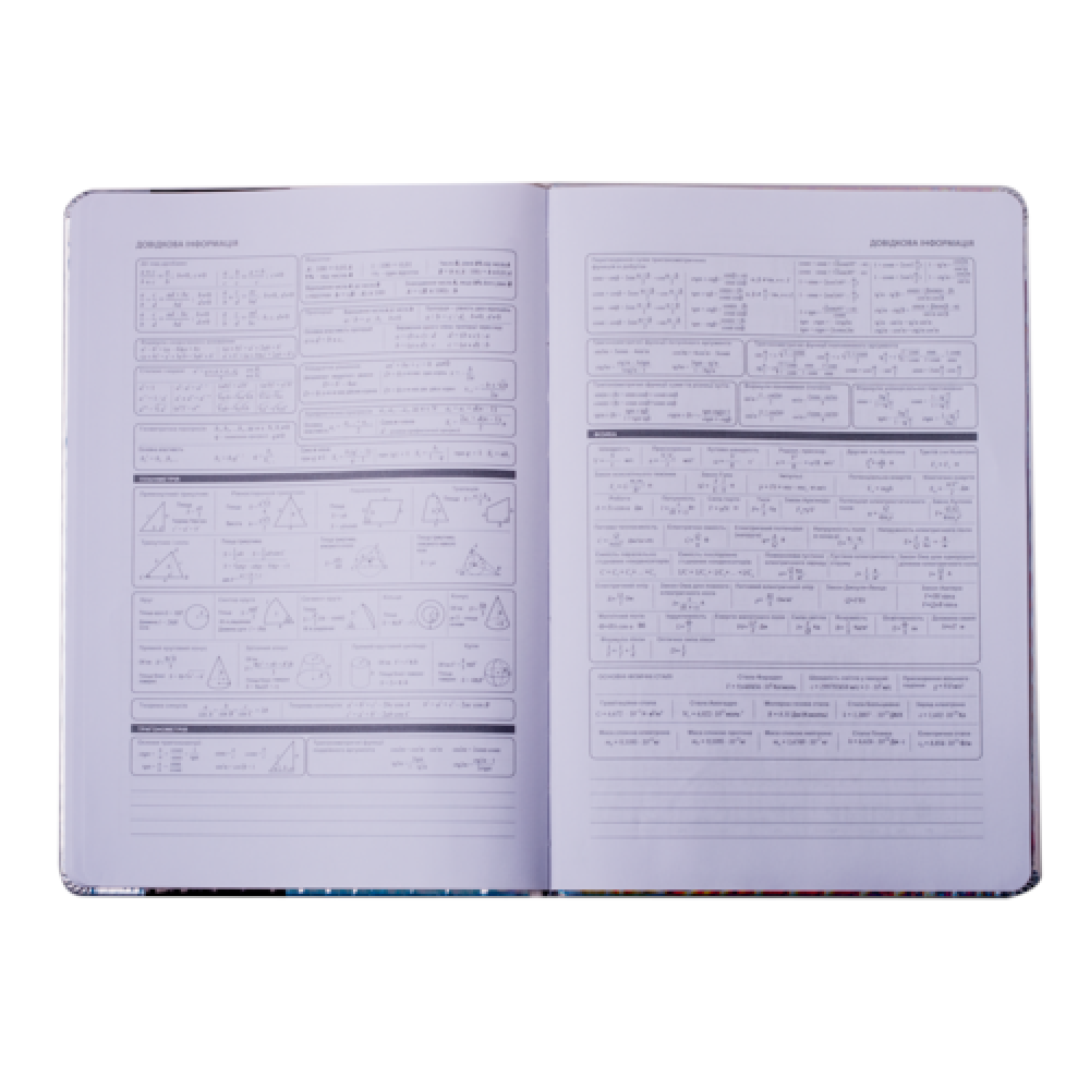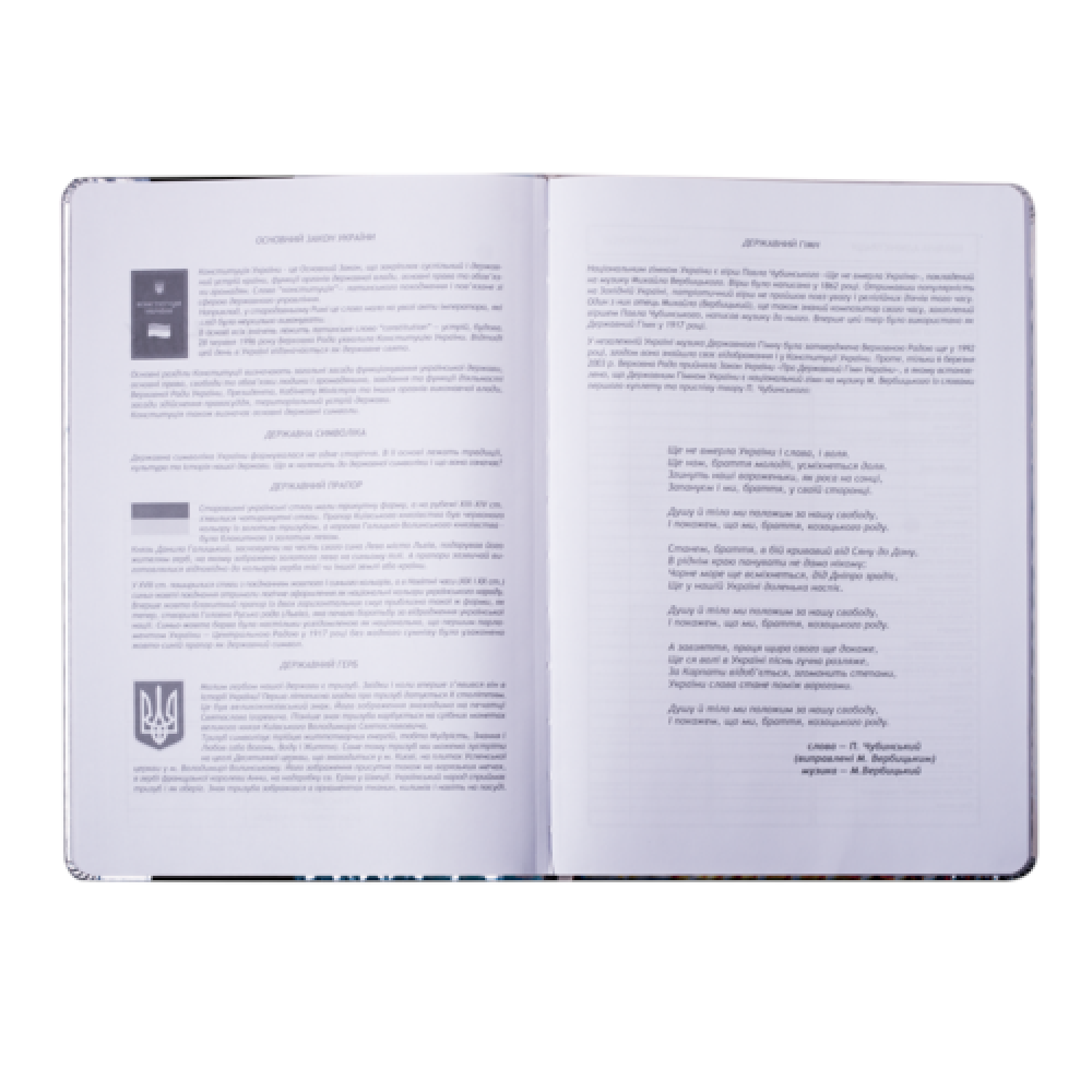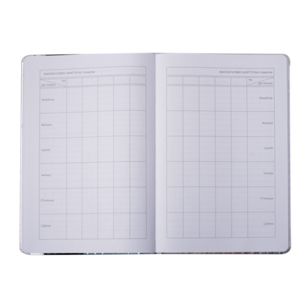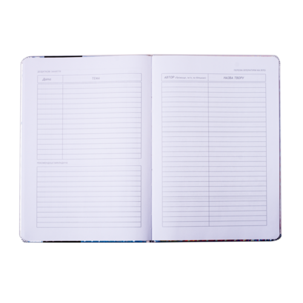 Формат B5. Кількість аркушів 48. Обкладинка з штучн. PU-шкіри, з поролоном. Декор - нашивка з штучн.шкіри, ніжки котика рухаються, будучи прикріпленими металевими заклепками, друк на лицьовій і зворотній стороні обкладинки: шовкографія. Дизайнерське оформлення форзаців за мотивами дизайну обкладинки. Внутрішній блок - білі аркуші, офсет, 70 г/м2. Зміст блоку - сторінки для персональних даних, інформації про вчителів, розкладу на семестри, табель успішності, розклад на тиждень (6 днів), довідкова інформація з основними формулами з різних предметів.