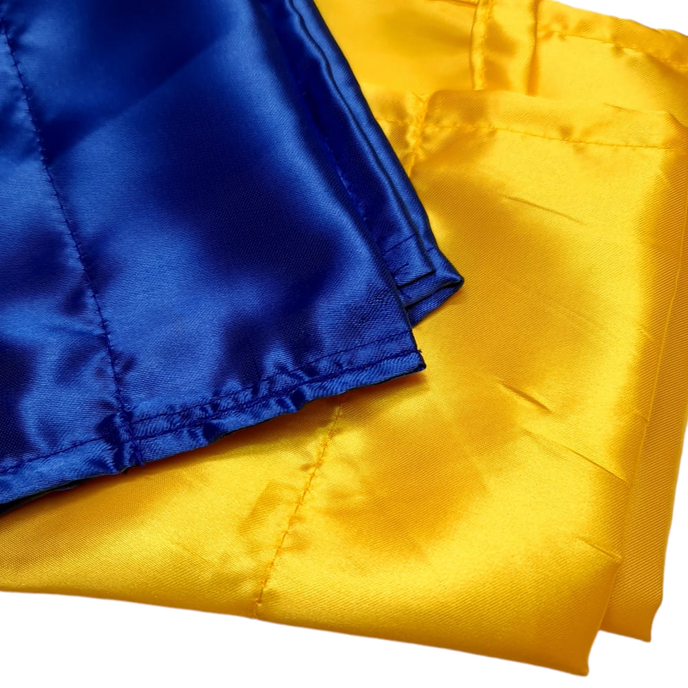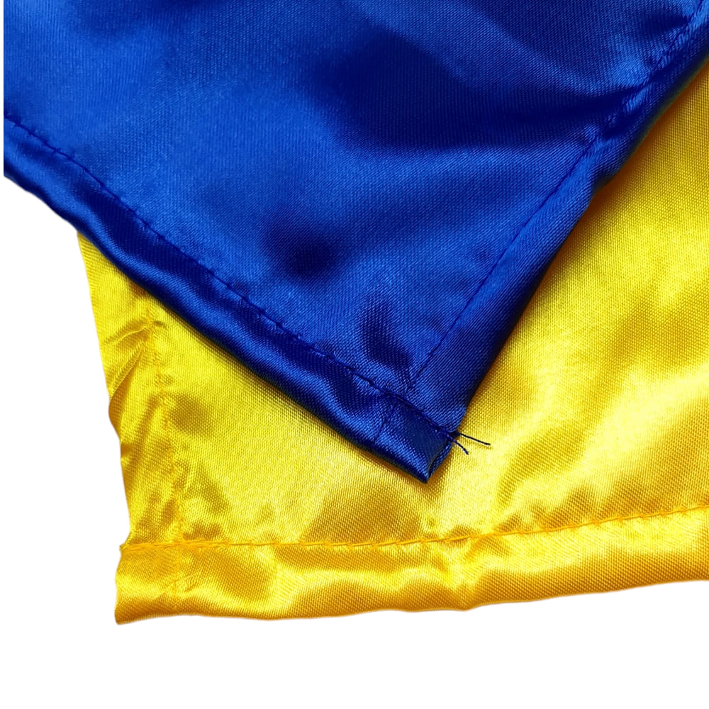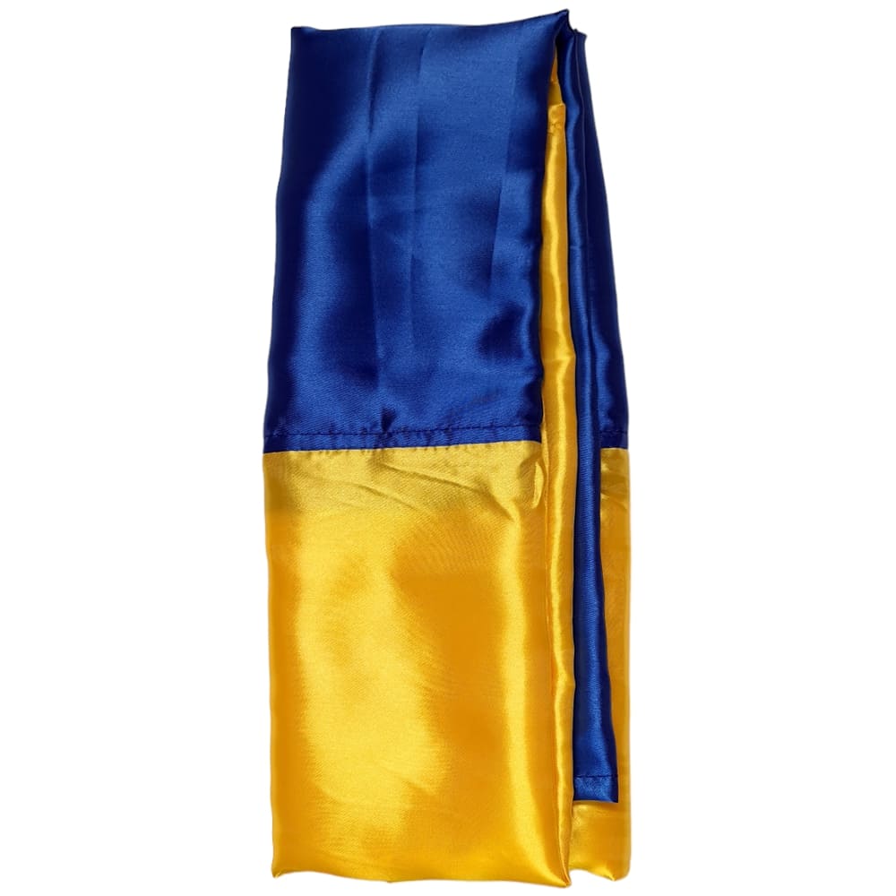 Прапор України виготовлений з двох рівних частин тканини, зшитих між собою. Обшитий по периметру. Довжина - 150 см; ширина - 100 см. Має кишеню під древко. Тканина - атлас.