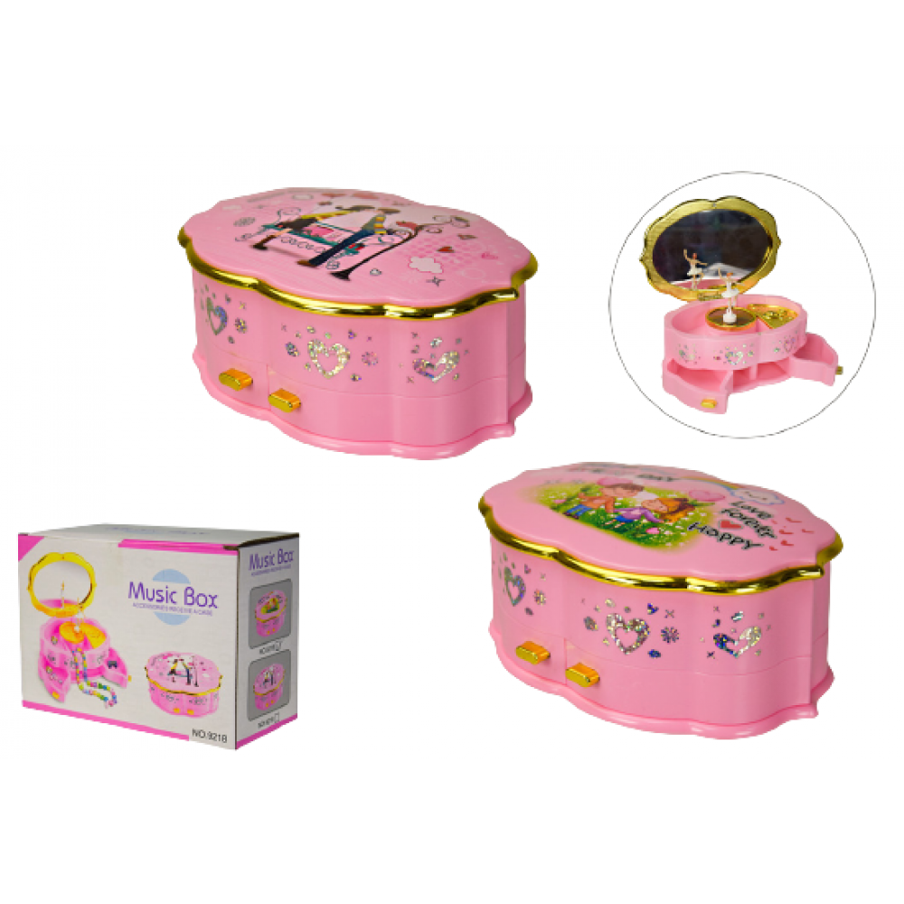 Музична шкатулка. З відділеннями для прикрас та відкидною кришкою. Функції: заводний механізм, балерина обертається магнітом.