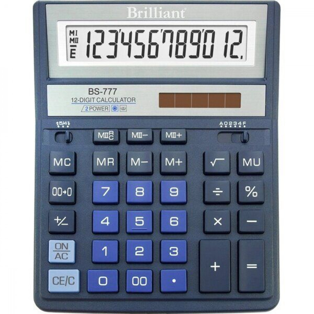Brilliant BS-777BL - настільного класу калькулятор з живленням від сонячної батареї або літієвої LR54. На борту передбачена дворівнева пам'ять. Висновок показників йде на 12-ти розрядний рідко-кристалічний дисплей. Радує ефективний захист від залипання клавіш. Енергоспоживання досягнуто автоматичним вимиканням. Розміри: 157 x 200 x 31 міліметр.