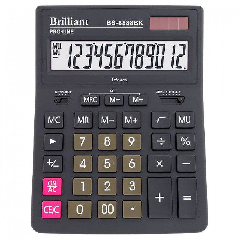 Калькулятор Brilliant BS-8888BK - настільний дванадцятирозрядний калькулятор з дворівневою пам'яттю. Калькулятор виготовлений із пластику з акриловим покриттям. Колір цифрової клавіатури відрізняється від кольору основи. Є захист від залипання клавіш. Особливості: клавіша "підвищення ціни"; клавіша зміни знака числа; клавіша видалення останньої цифри; клавіша "00"; перемикач "режим округлення"; перемикач "кількість знаків після коми". Розмір: 155x205x35 мм. Корпус: пластиковий. Колір чорний. Живлення: сонячна + літієва батарея. Автовимкнення живлення.