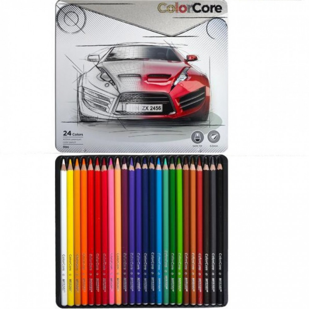 Набір кольорових художніх олівців в металевій коробці, 24 кольори. М'які кольорові олівці залишають яскравий і барвистий слід на папері всіх типів. Кольорові олівці Marco не потребують сильного натискання на олівець для отримання яскравої лінії малюнка, що дозволяє без особливого навантаження отримати яскраву картинку навіть самому маленькому художнику. Товщина лінії 4 мм.
