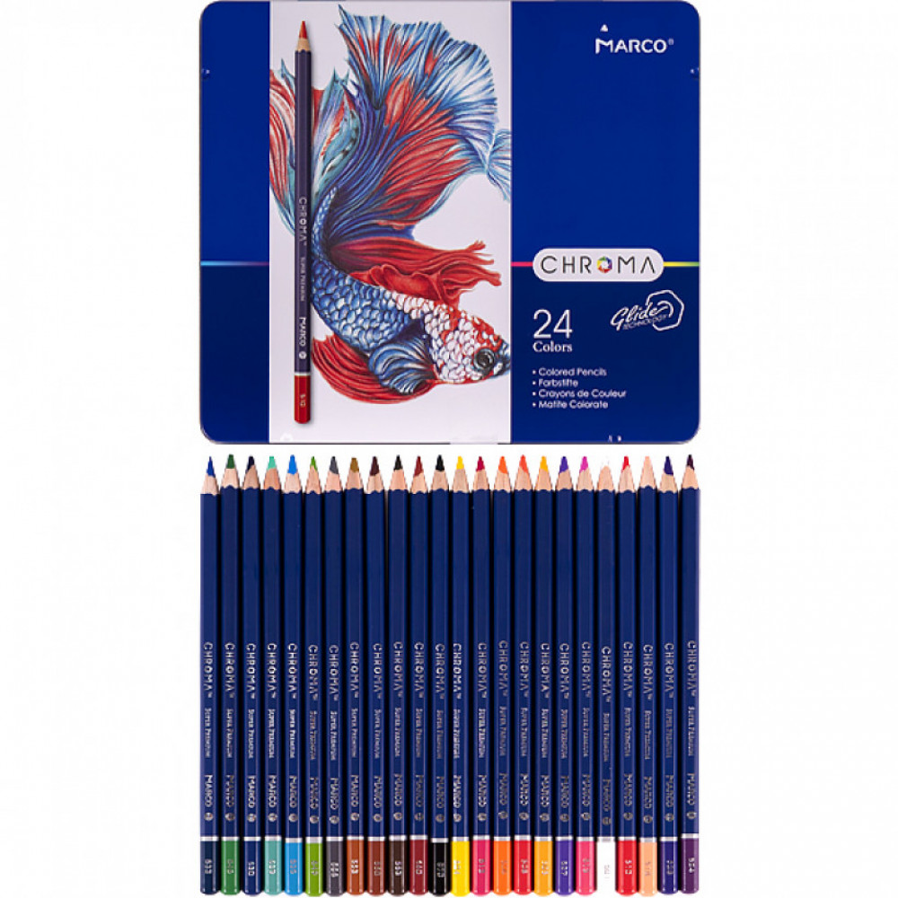 Олівці кольорові Marco Chroma 24 кольори в метал. кейсі (8010-24TN) - це нова лінійка професійних олівців Marco. Корпус Chroma зроблений з деревини тополі, а діаметр грифеля становить 3.3 мм. Якість даної серії можна порівняти з моделями Renoir. Припадуть до смаку всім любителям малювання, також художникам і ілюстраторам. Обов'язково спробуйте їх в справі!