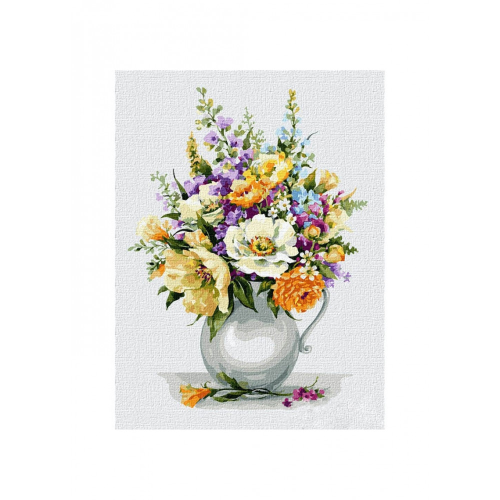 У набір входить натягнуте на дерев'яний підрамник прогрунтоване бавовняне полотно, з нанесеними та пронумерованими контурами кольорів малюнка, пронумеровані акрилові фарби в щільно закритих контейнерах (від 14 до 36 кольорів), три пензлики, контрольний лист, інструкція з розфарбовування.