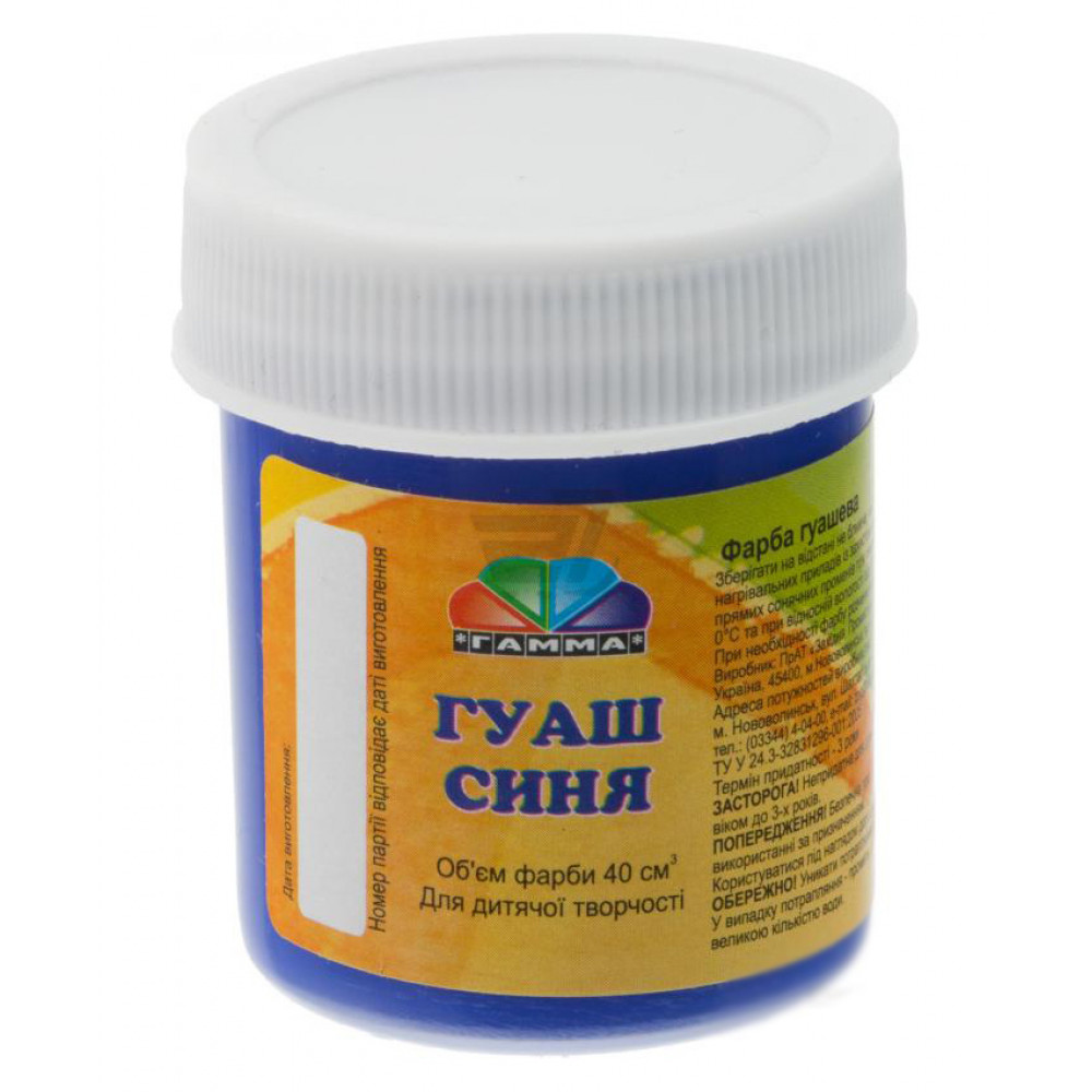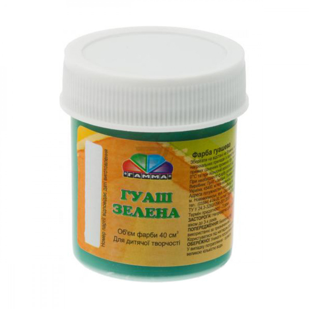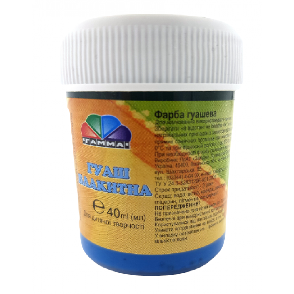 Гуашева фарба призначена для художників. Використовується для малювання та живопису, не розтікається, прекрасно поєднується, практична в роботі - сохне протягом декількох хвилин. Не втрачає насиченості кольору після висихання. Може використовуватися на різних засадах: папір, картон, дерево, художнє полотно. На водній основі, не токсична.