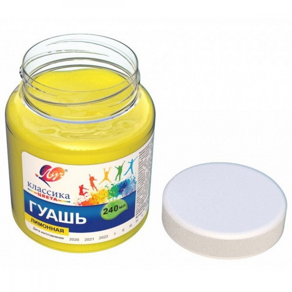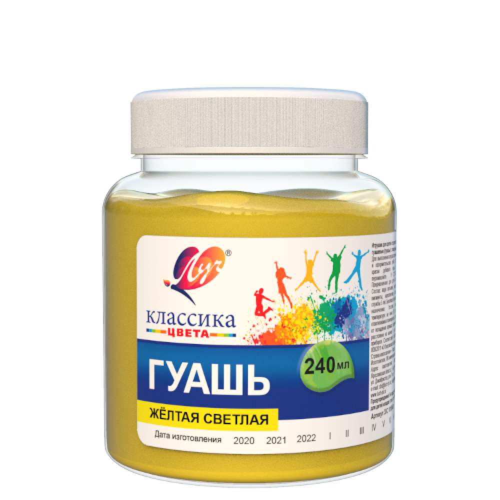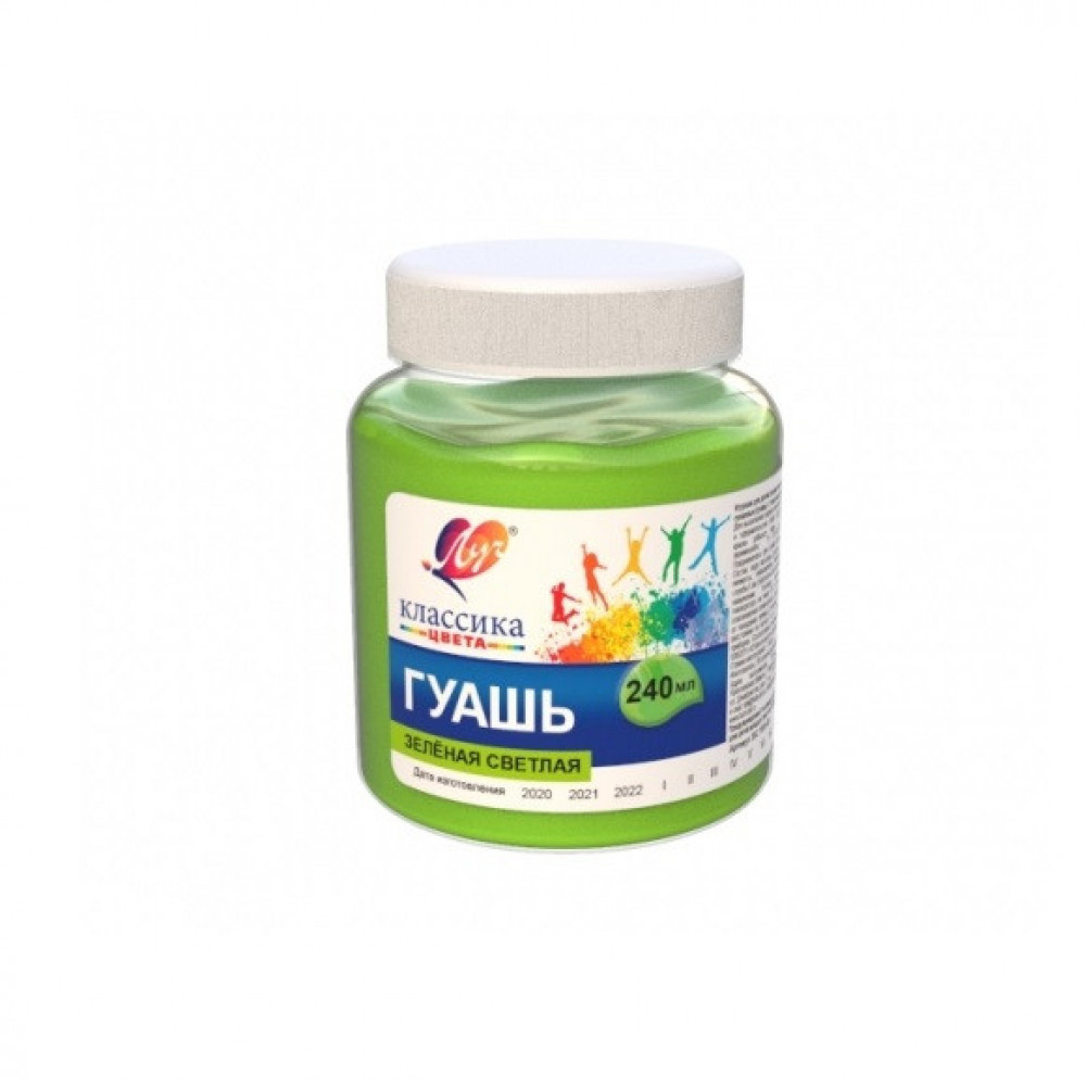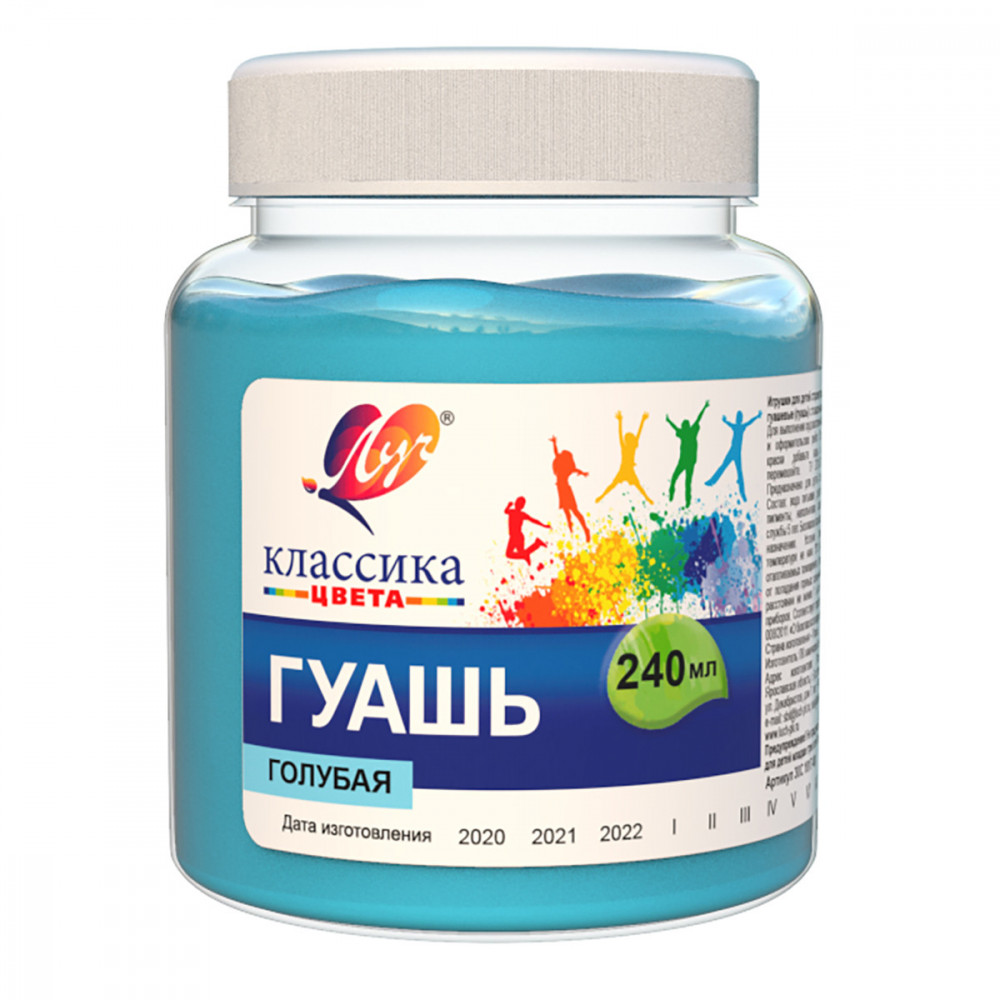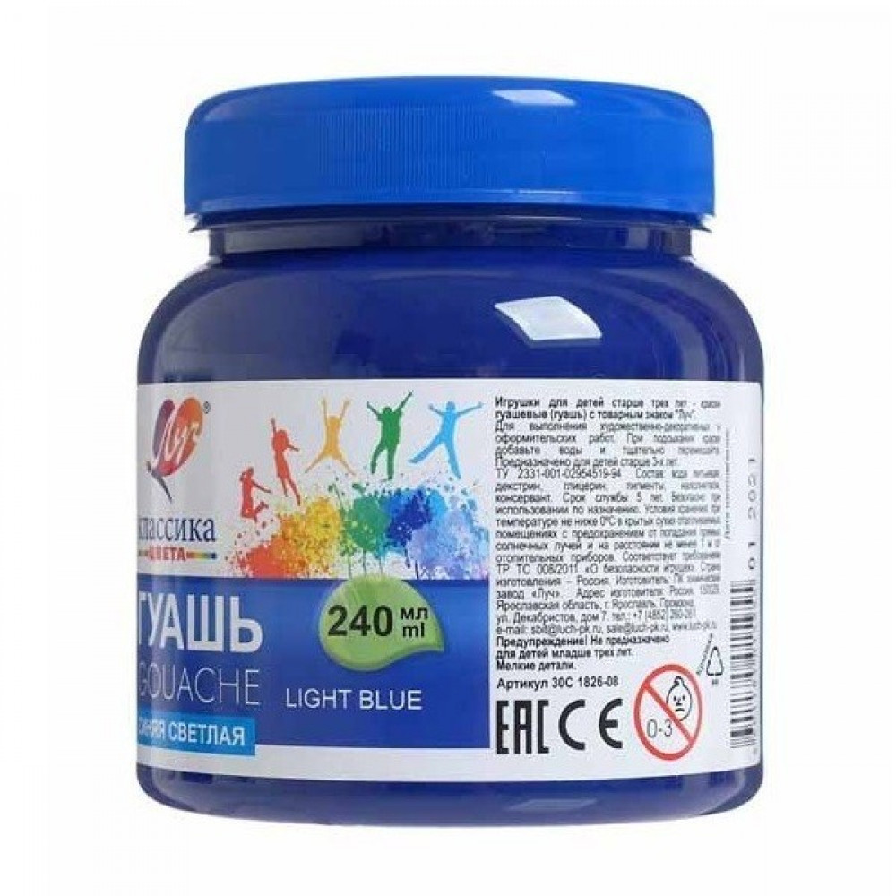 Гуаш "Луч" в пластиковій банці об'ємом 240 мл, вага 0,45 кг, кришка закручується. Чудово підходить для дитячої творчості, освоєння техніки малювання на папері, картоні, дереві, полотні, тканині або склі.