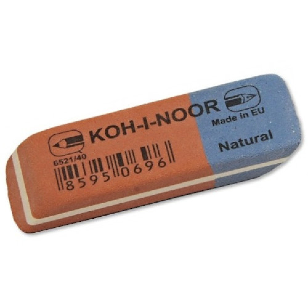 Комбінована гумка з натурального каучуку. Червона сторона - м'яка, для стирання сліду олівців твердості 8В-10Н. Синя сторона - містить абразивні речовини, для стирання сліду ручок, кольорових олівців, чорнила.