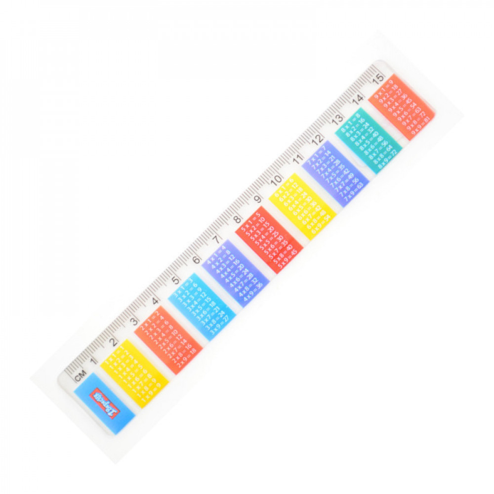 Пластикова лінійка, прозора, з таблицею множення. Шкала вимірювання - 15 см. Призначена для створення креслень, а також для точного вимірювання лінійних розмірів і інших геометричних параметрів.