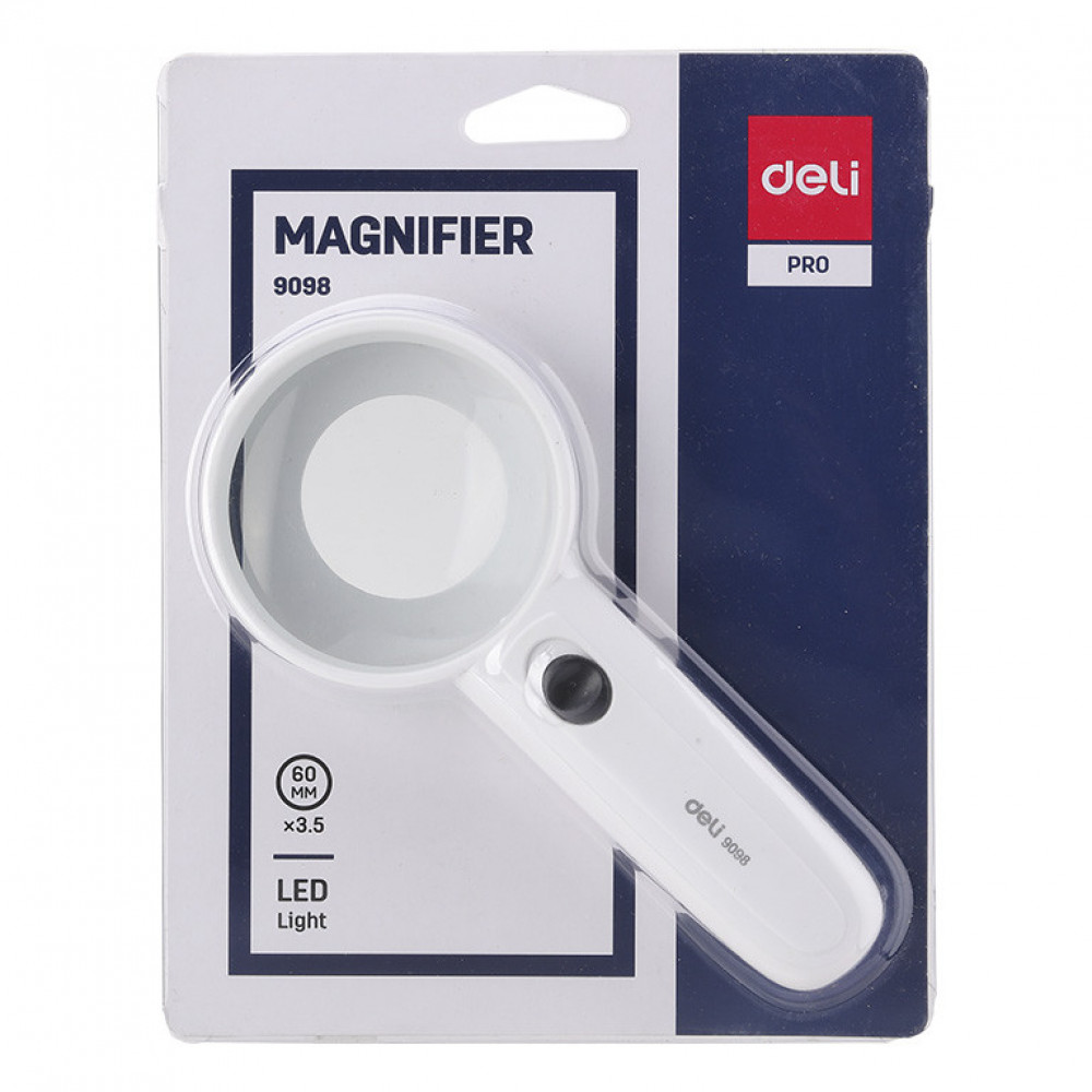 Лупа офісна Deli 9098 d = 60 мм x 3.5 LED підсвічування. Лупа Deli 9098 має діаметр 60 мм. Поставляється в пластиковому корпусі білого кольору. Має вбудоване діодне підсвічування, для підсвічування використовуються 3 батарейки типорозміру ААА. Дозволяє робити 3,5-кратне збільшення.