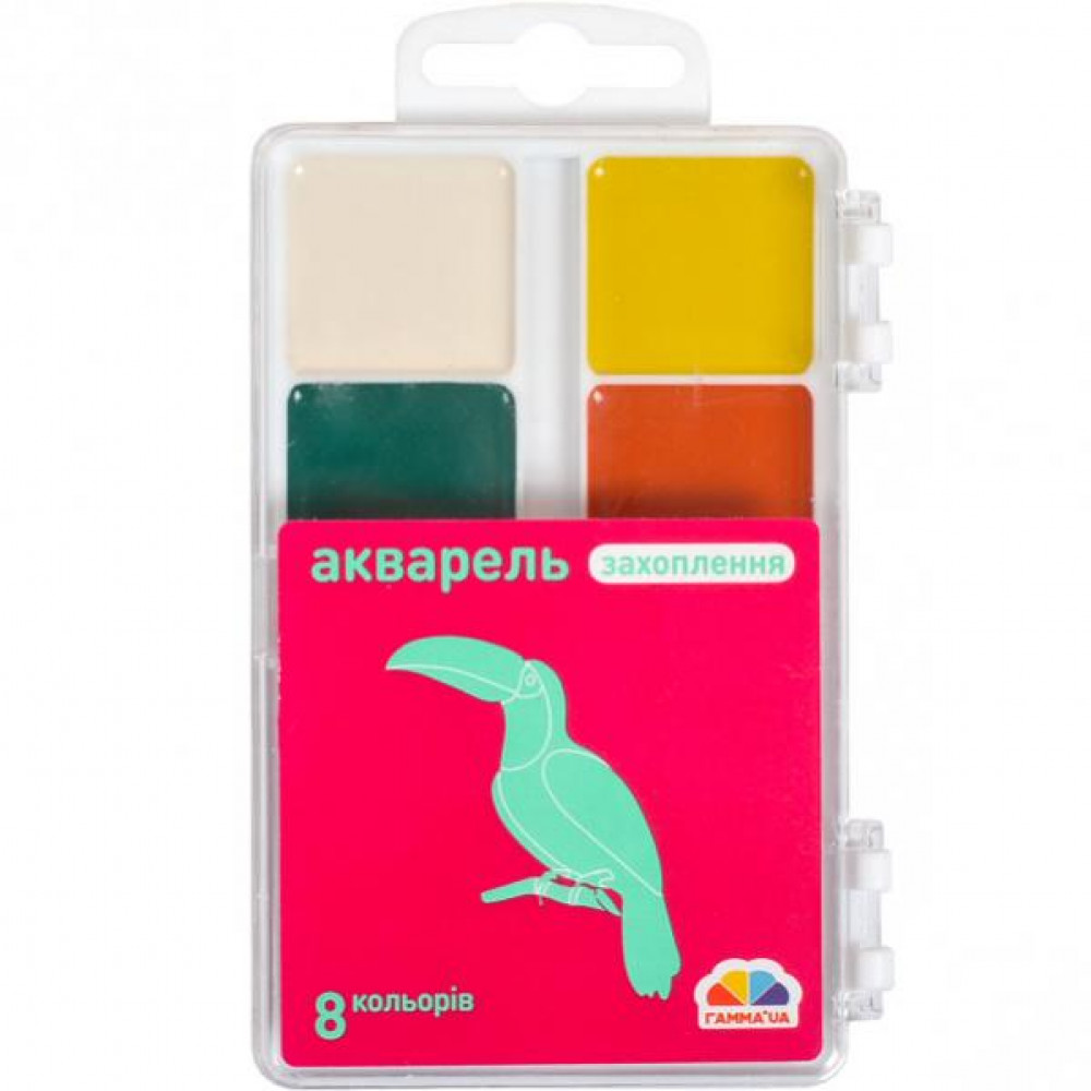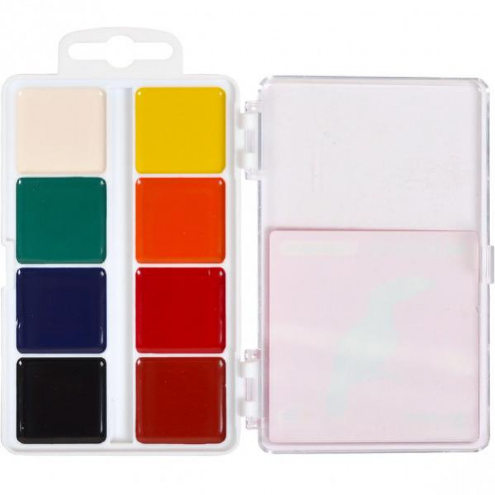 Акварель 8 кольорів, медова, в пластиковій упаковці. Широко використовуються для дитячої творчості, а також для художніх, оформлювальних і декоративно-прикладних робіт. 11,5 х 7,5 см