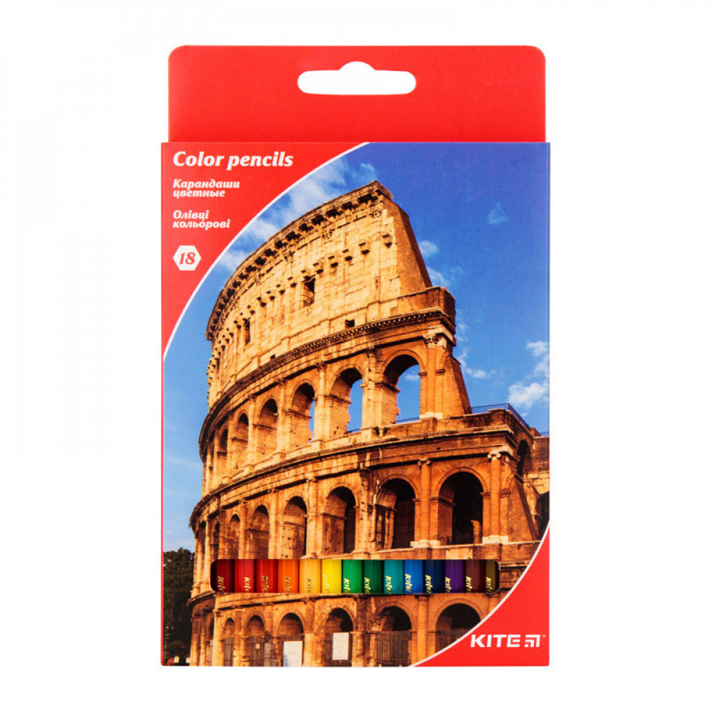 Кольорові шестигранні олівці Kite в картонній упаковці. Олівців в наборі 18, палітра гармонійна і економить місце в пеналі і рюкзаку дитини. Дитячі олівці малюють м'яко, при легкому натисканні дитина отримає яскраву картинку без праці. Грифель товщиною в 3 мм малює плавно, не кришиться і не дряпає папір. При заточуванні або падінні не ламаються і не кришаться. Кольорові олівці виготовлені з міцної натуральної деревини. Олівці покриті лаком в тон кольору, який запобігає розсиханню і появі тріщин на корпусі. Довжина виробу 175 мм. Набір олівців Kite рекомендований для дошкільнят і школярів.