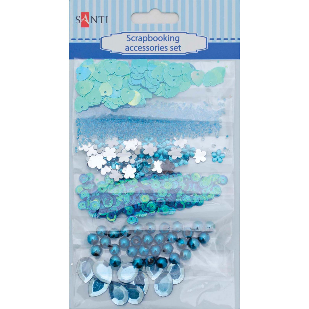 Набір різноманітних декоративних елементів призначений для виготовлення листівок, скрапбукінгу. В упаковці 6 видів прикрас блакитних відтінків.