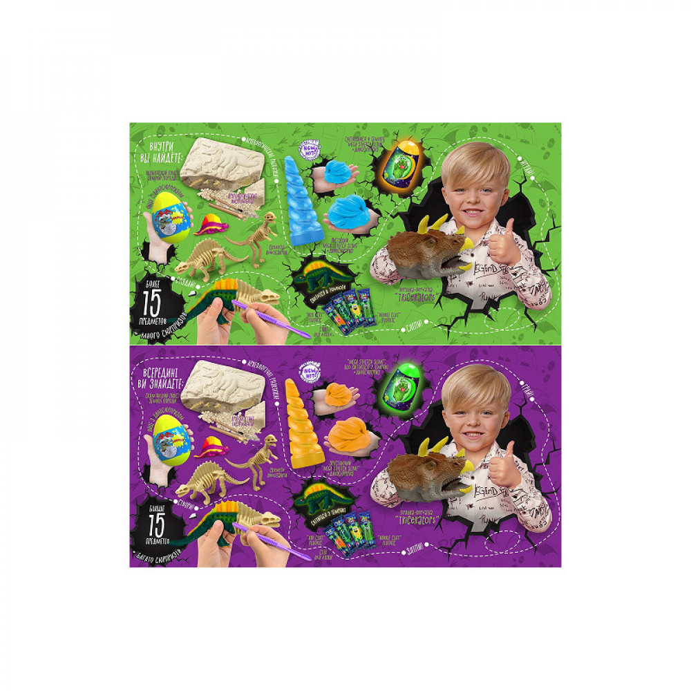 Комплектація: скам'янілий шар земної породи з двома скелетами динозаврів - 1 шт, стек - 2 шт, пензлик - 1 шт, пластилін Air Clay Fluoric - 2 шт, кульковий пластилін Bubble Clay Fluoric - 2 шт, іграшка-перчатка - 1 шт, в'язка маса-лизун у пластиковій колбі - 2 шт, яйце-сюрприз - 1 шт, інструкція - 1 шт.
