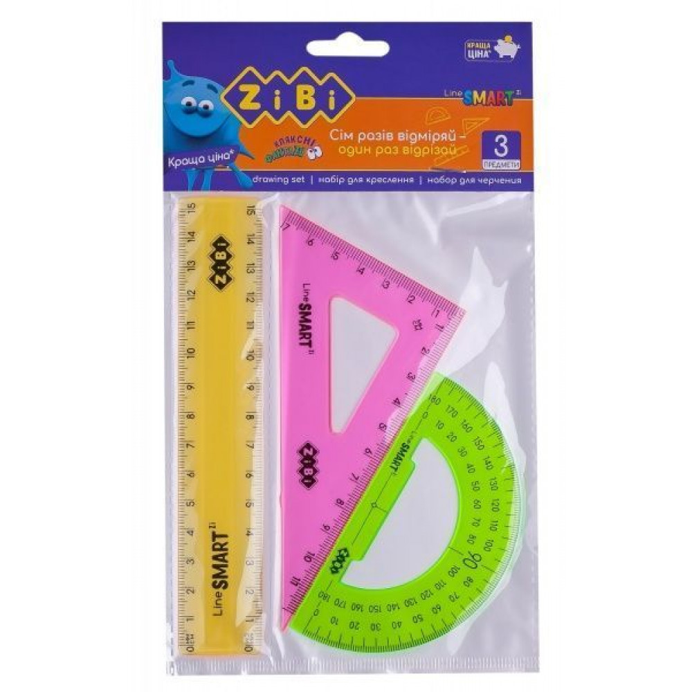 Комплект інструментів для вимірювання та креслення з 3 предметів (лінійка, трикутник, транспортир). Матеріал - міцний пластик яскравих неонових кольорів. Упаковка - прозорий пакет з картонним завісою (з європідвісом).