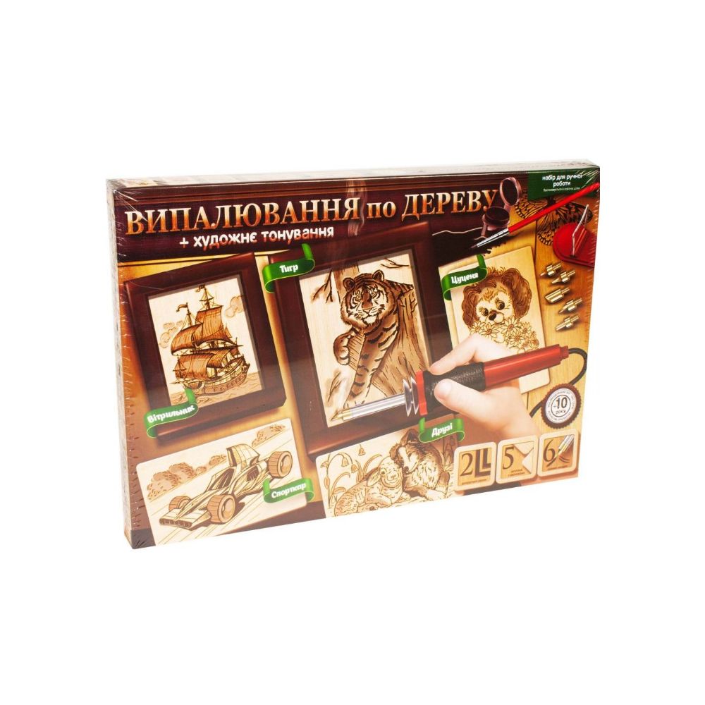 Ми подбали, щоб Ваша робота була ще цікавішою і не обмежувалася випалюванням, доповнивши її технікою художнє тонування. Поверх готової роботи, акуратно, спеціальною фарбою, наноситься шар тонуючого покриття, надає текстурі дерева художнього забарвлення та створює ілюзію реалістичності. Отже, отримуємо випалювач, заготівлі та фарбу, і приступаємо до заворожливого процесу - випалювання та тонування. Освойте найдавніше мистецтво, що вражає уяву людей своєю витонченістю. Комплект містить: декоративну рамку, заготівку для створення картини, насадки для випалювача, електровипалювачі, підставку для випалювача, фаруа, що тонує, пензлик, покрокову інструкцію. Розмір упаковки (ДхШхВ) 40х370х250 мм.
