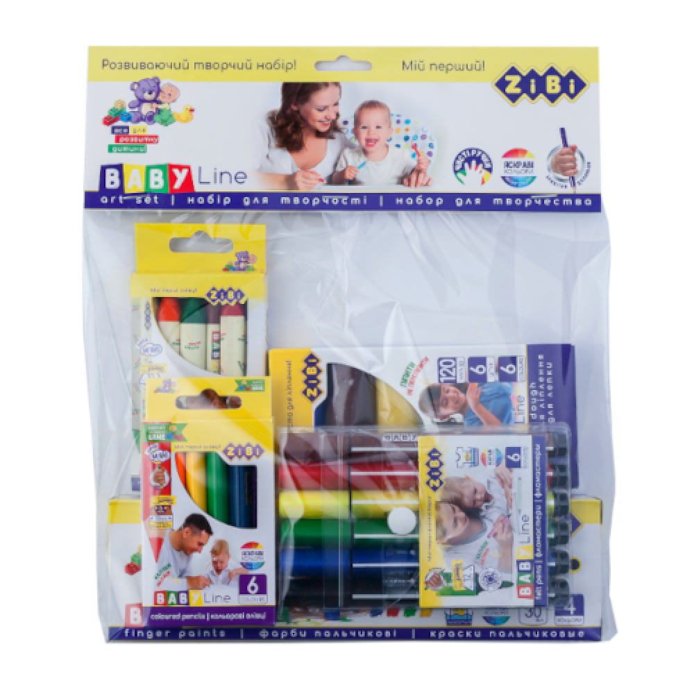 Склад набору: олівці кольорові mini JUMBO, 6 кольорів (ZB.2450), олівці воскові тригранні JUMBO, 6 кольорів (ZB.2483), фломастери JUMBO, 6 кольорів (ZB.2806), фарби пальчикові, 4 кольори (ZB.6564), набір тіста для ліплення, 6 кольорів по 20 г (ZB.6253), упаковка - прозорий пакет з картонним завісом з європідвісом.