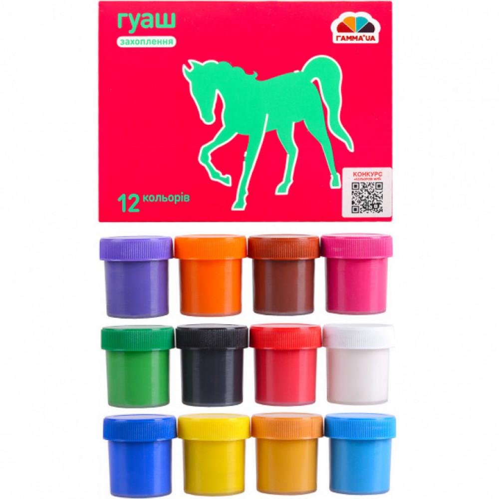 12 кольорів, обсяг фарби одного кольору 20 мл. Гуашшю можна працювати не тільки на папері, а й на полотні, на тканині, картоні, фанері. Гуаш широко застосовується в декораційного живопису, при виконанні різних ескізів. Обсяг: 240 мл (12х20 мл).