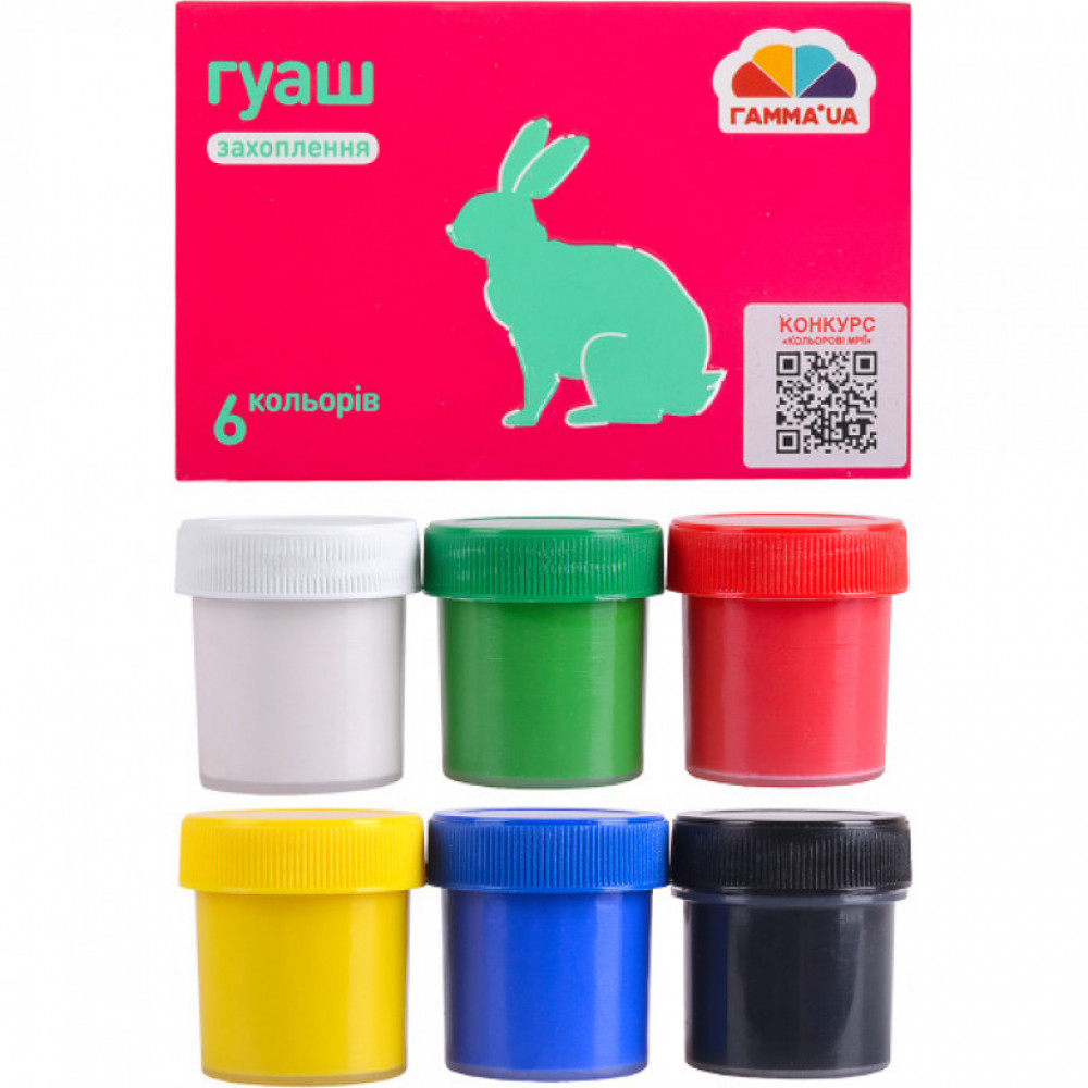 6 кольорів, обсяг фарби одного кольору 20 мл. Гуашшю можна працювати не тільки на папері, а й на полотні, на тканині, картоні, фанері. Гуаш широко застосовується для декораційного живопису, при виконанні різних ескізів. Обсяг: 120 мл (6х20 мл).
