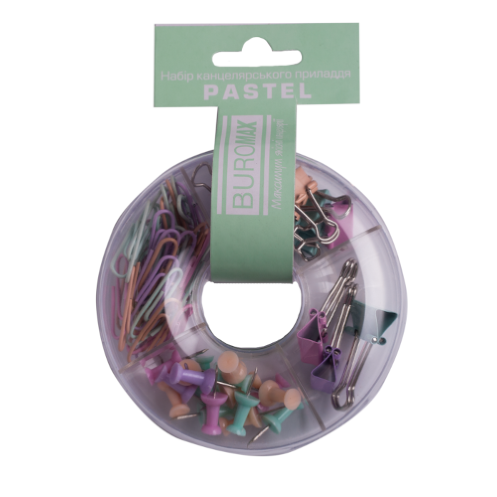 Елегантний, стильний і дуже зручний канцелярський набір в ніжних пастельних кольорах в пластиковому боксі. Пластиковий бокс розділений на 4 сектори, кожен з яких призначений для одного типу канцелярського приладдя. У набір входять 40 пластикових канцелярських скріпок (28 мм), 3 біндера (19 мм), 8 біндеров (15 мм), 15 канцелярських кнопок - гвоздики (10/12/10 мм).