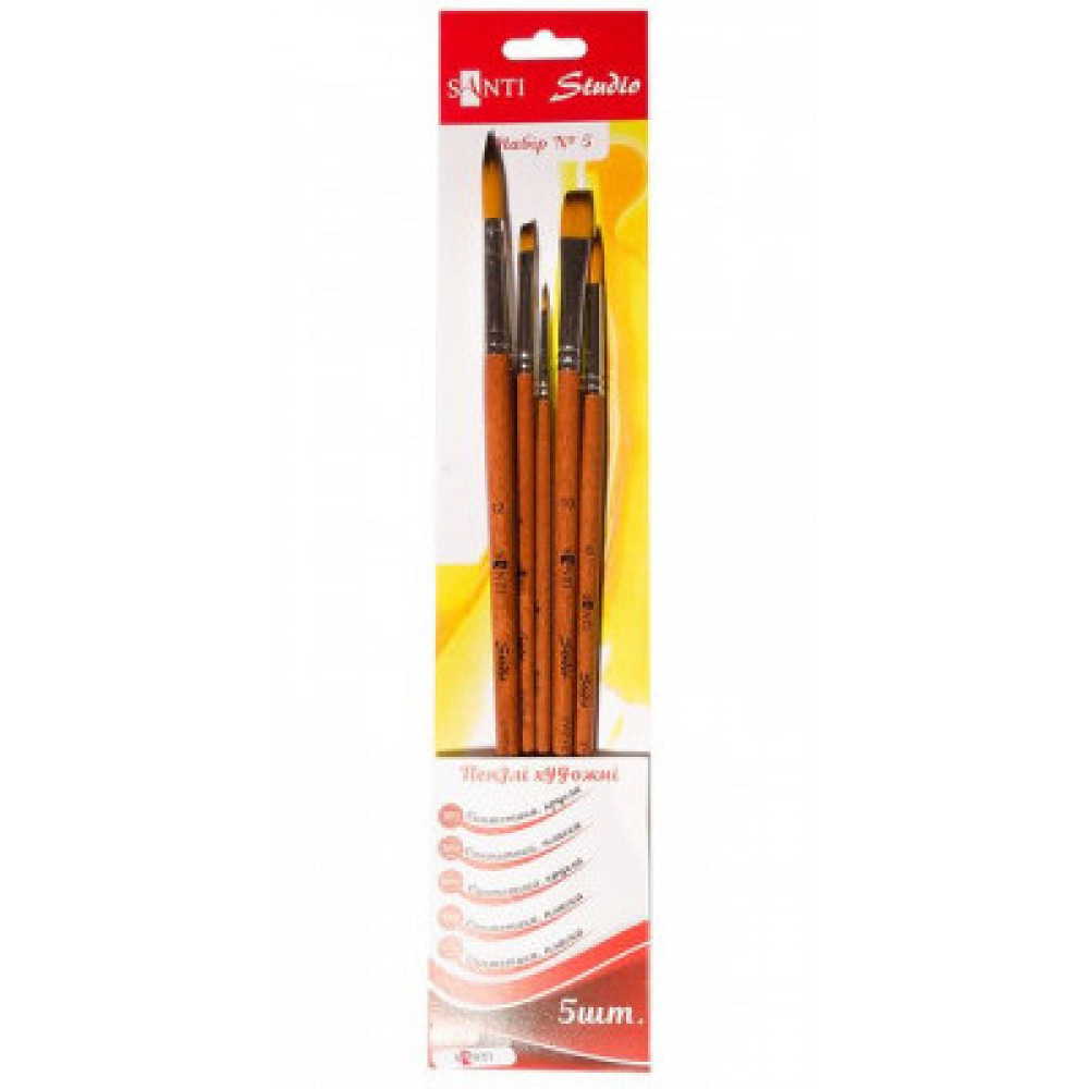 Художні пензли з синтетичного ворсу - відмінний вибір для використання в різних видах живопису. Вони підійдуть для роботи як з рідкими видами фарби (акварель, гуаш), так і для живопису олійними і акриловими фарбами. Синтетичні пензли від бренду Santi Studio відмінно утримують рідину, характеризуються пружністю і еластичністю. Відмінно зберігають пружність при намоканні. Круглі пензли використовуються для нанесення ліній різної товщини, а також для промальовування дрібних деталей. Плоскі пензли досить універсальні, вони здатні утримувати багато фарби і використовуються як для заливки великих ділянок, так і для створення чітких широких мазків. У набір входять пензли круглі №1, №6, №12 і плоскі пензли №4, №10.