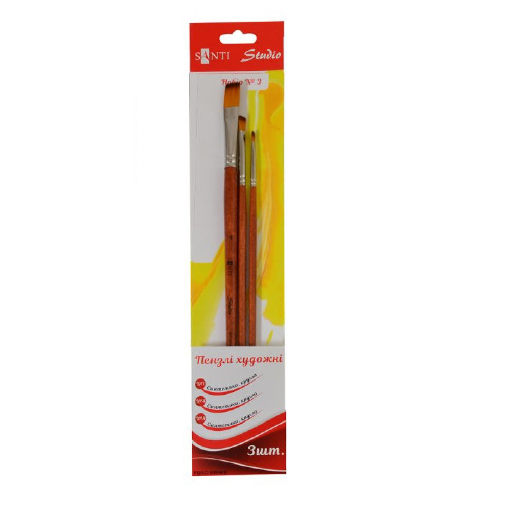 Художні пензли з синтетичного ворсу - відмінний вибір для використання в різних видах живопису. Вони підійдуть для роботи як з рідкими видами фарби (акварель, гуаш), так і для живопису олійними і акриловими фарбами. Синтетичні кисті від бренду '' Santi Studio '' відмінно утримують рідину, характеризуються пружністю і еластичністю. Відмінно зберігають пружність при намоканні. Плоскі пензли досить універсальні, вони здатні утримувати багато фарби і використовуються як для заливки великих ділянок, так і для створення чітких широких мазків.