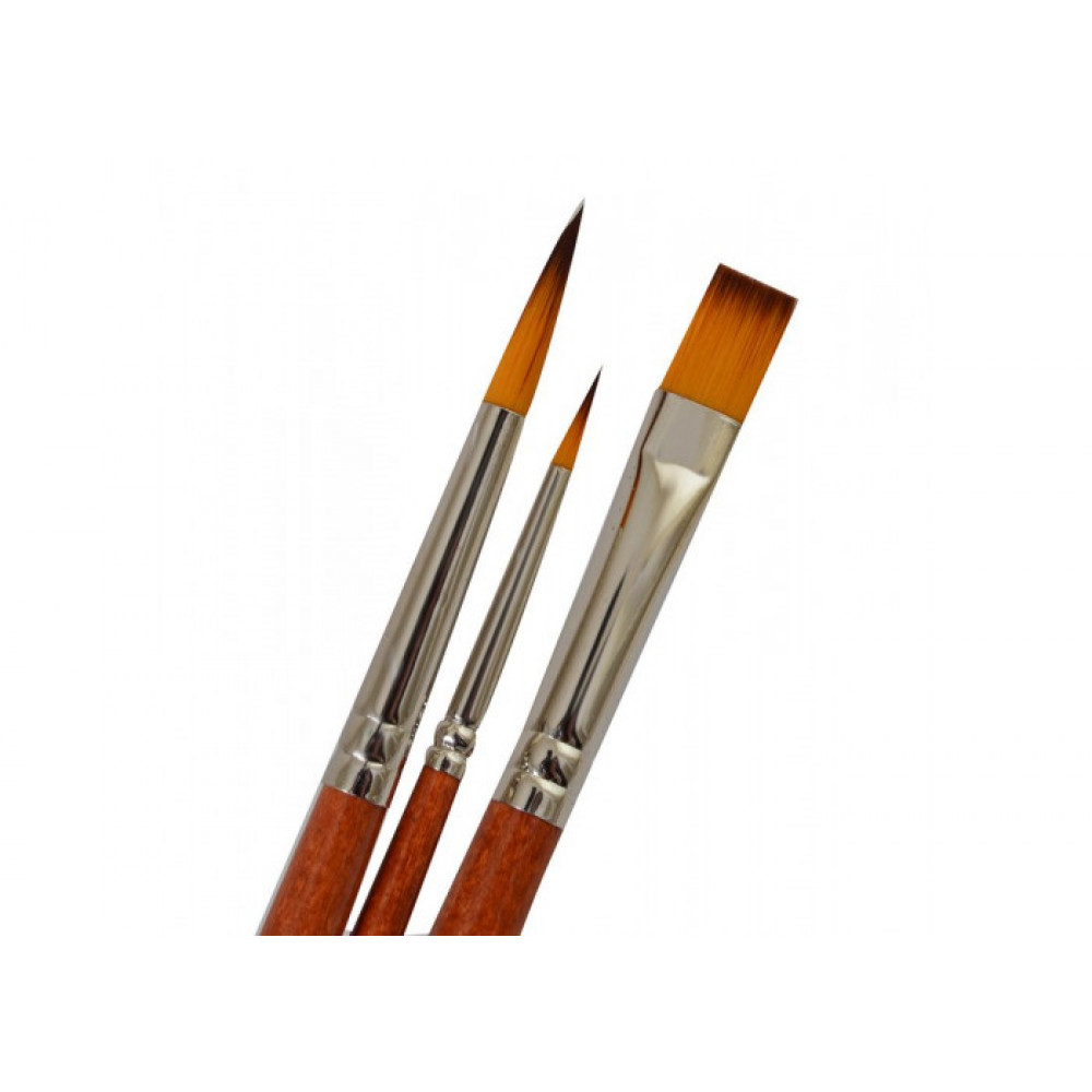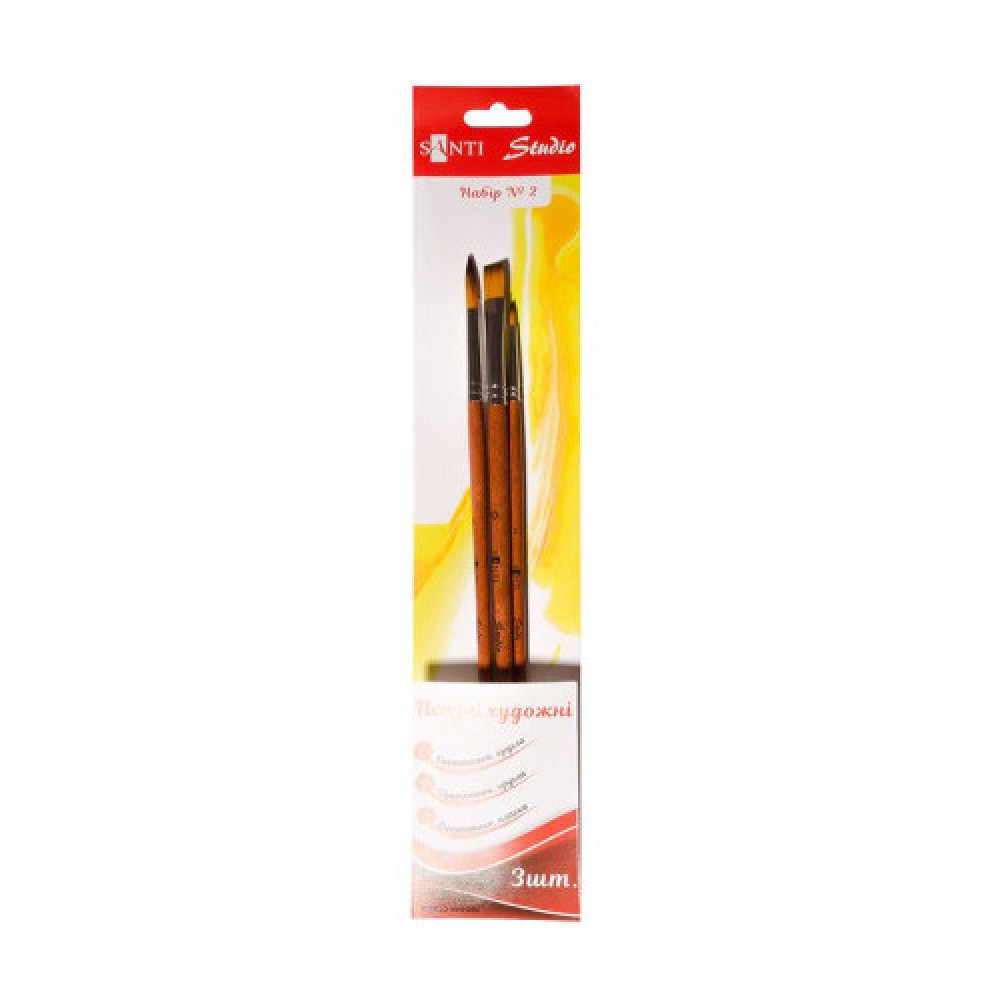 Художні пензли з синтетичного ворсу - відмінний вибір для використання в різних видах живопису. Вони підійдуть для роботи як з рідкими видами фарби (акварель, гуаш), так і для живопису олійними і акриловими фарбами. Синтетичні пензли від бренду "Santi Studio" відмінно утримують рідину, характеризуються пружністю і еластичністю. Відмінно зберігають пружність при намоканні. Круглі пензли використовуються для нанесення ліній різної товщини, а також для промальовування дрібних деталей. Плоский пензель досить універсальний, він здатний утримувати багато фарби, використовується як для заливки великих ділянок, так і для створення чітких широких мазків. У наборі 2 пензлика круглі №2 і №8 та 1 пензлик плоский №10.