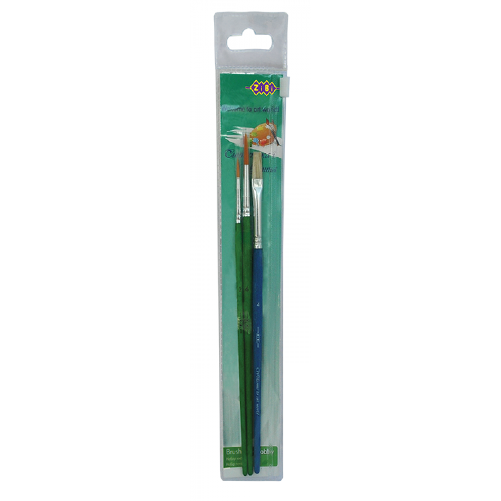 Пензлики з синтетики універсальні у використанні: вони підійдуть як для водорозчинних фарб (акварелі, гуаші, темпери), так і для масла і акрилу. Такі пензлики менш схильні до руйнування під впливом розріджувачів, комах, барв, прямих сонячних променів. Дерев'яна ручка, пофарбована. Суцільнотягнена алюмінієва обойма. Блістерна упаковка містить 2 круглих пензлика з синтетики (2 і 6 розмірів) і 1 плоский пензлик з щетини 4 розміру.