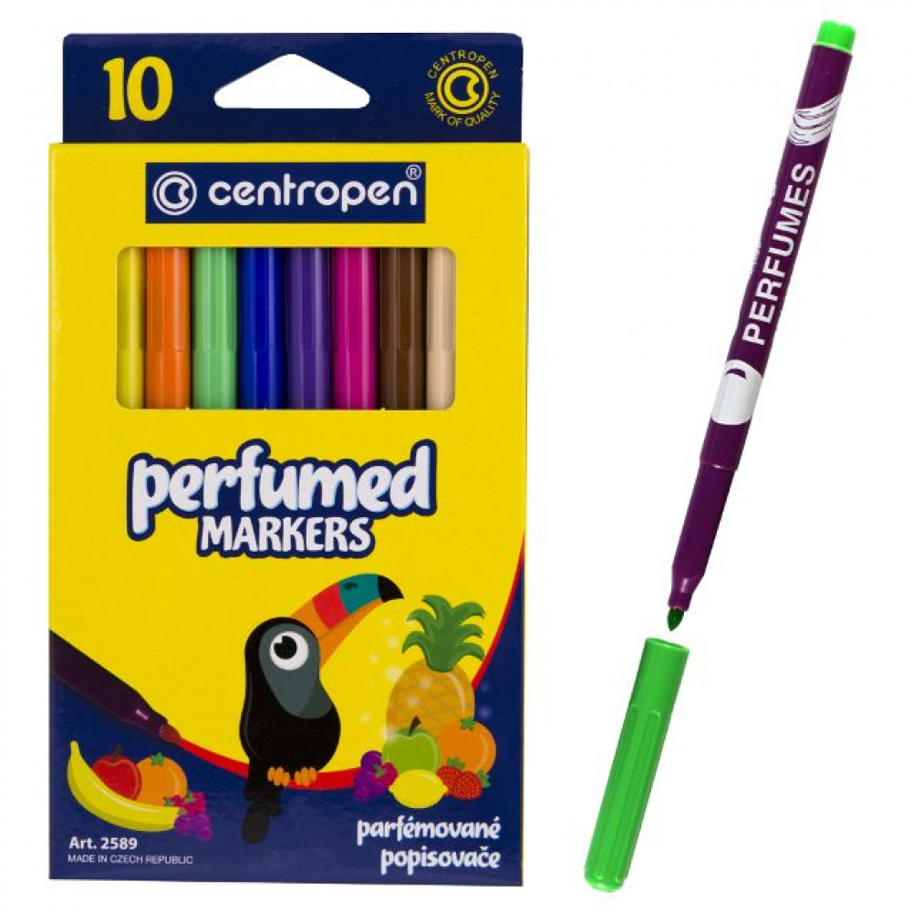 Набір фломастерів з парфумованими чорнилами. 10 фруктових ароматів! Яскраві і насичені кольори. Легко змиваються з рук і відпираються з одягу. Безпечні для здоров'я чорнила. Вентильований ковпачок. Ергономічний пишучий вузол. Товщина лінії писання - 2 мм.