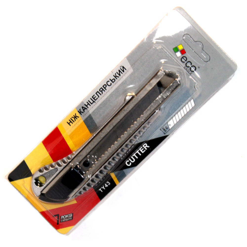Ніж канцелярський торгової марки Eco-Eagle. Призначений для різання картону, паперу. Обладнаний металевою направляючою з гвинтовим фіксатором та механізмом автоматичної подачі лез для безпечної роботи. Ручка ножа виготовлена з ударостійкого пластику для забезпечення довготривалого комфортного використання. Ковпачок ножа має пристрій для видалення сегменту леза, що затупилося. Довжина ножа 155 мм. Ширина леза 18 мм. Країна-виробник: Китай.