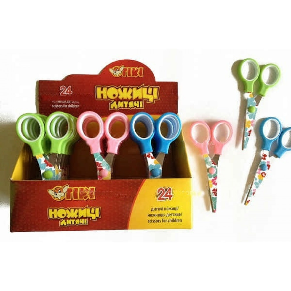 Яскраві кольорові дитячі ножиці з принтом на лезі. Леза ножиць виготовлені з нержавіючої сталі. Кольори ручок представлені в асортименті.