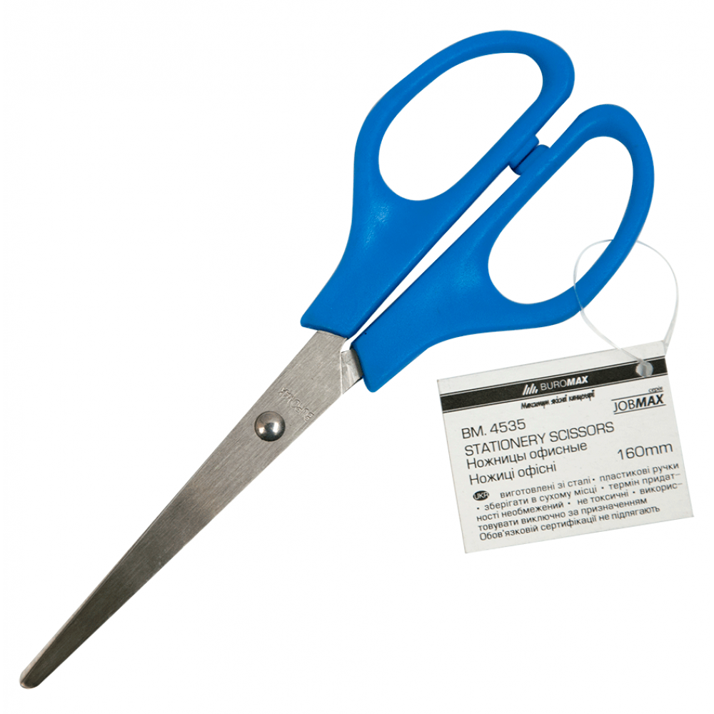 Ножиці для паперу, картону, плівки, тканин, паперу, що самоклєється. Леза з нержавіючої сталі. Пластикові ручки.