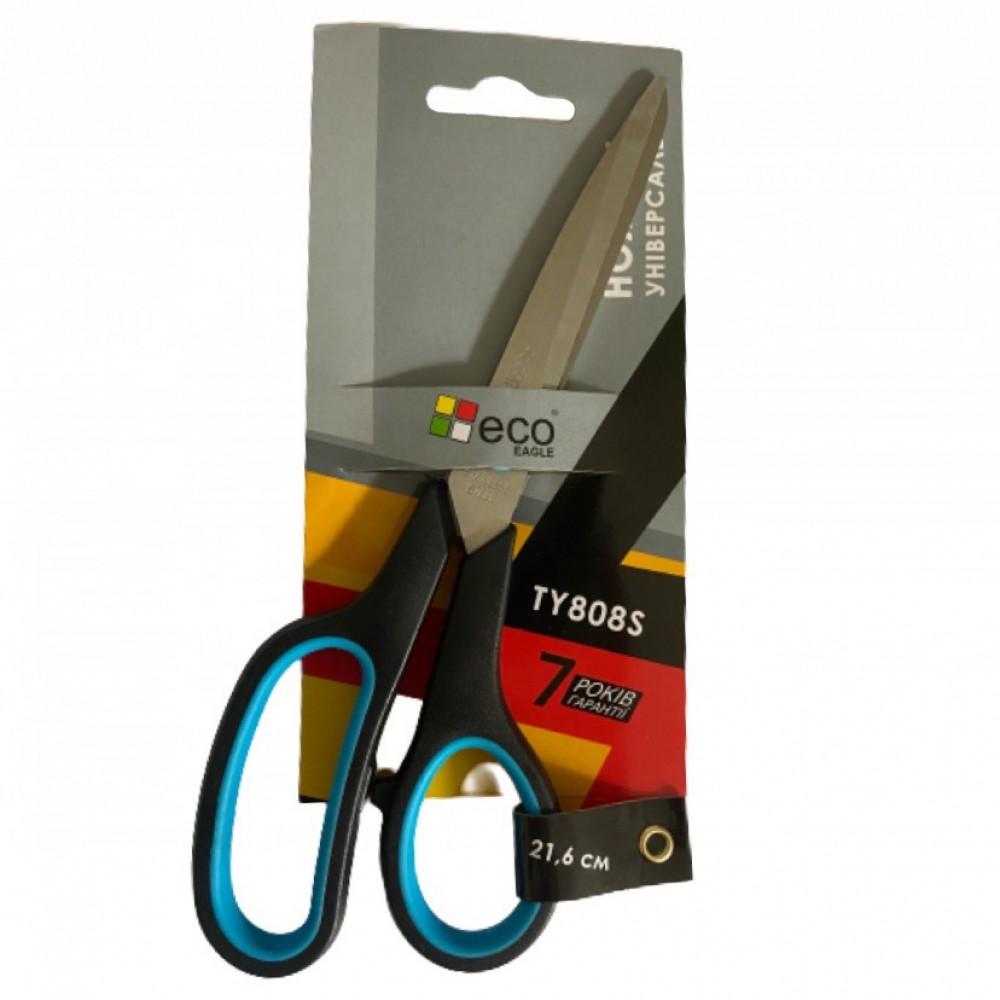 Ножиці Eco-Eagle TY808S — класичні офісні ножиці від відомого китайського бренду. Модель має довжину 21,6 см та надійні леза з нержавіючої сталі, скріплені між собою сталевим гвинтом. Рукоятки виконані у вигляді кілець ергономічної форми, а прогумовані вставки додають комфорту під час використання. Товар підходить для офісного та домашнього користування, відповідає стандартам якості та має всі необхідні сертифікати.