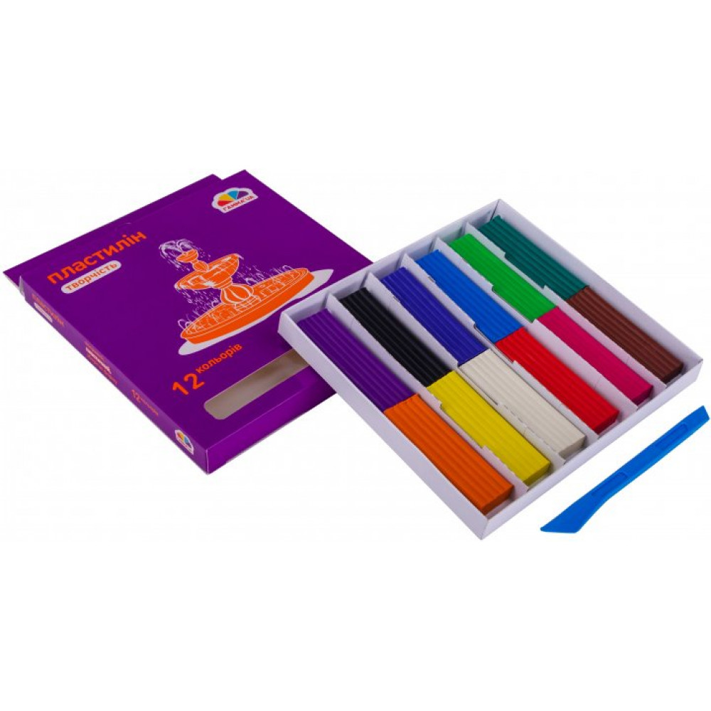 Пластилін серії "Творчість" призначений для ліплення і моделювання дітьми молодшого та середнього шкільного віку. Пластилін виготовляють на основі природного компонента - каолінів глини, тому перед використанням руки треба зволожити водою, щоб частинки пластиліну не прилипали до рук. Має яскраву сучасну упаковку. Головні переваги: легко розминається, не ламається при згинанні, не липне до рук за умови їх зволоження, не залишає жирних плям. Шматочки пластиліну легко зліплюються між собою. Не засихає при тривалому зберіганні. Не виділяє шкідливих речовин.