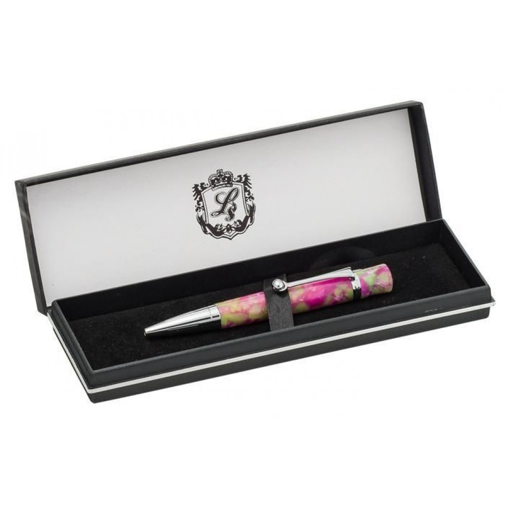 Акриловий корпус ручок Langres Fancy має яскравий салатово-рожевий візерунок із малюнком під граніт. Крутий декоративний елемент, що обертається, на кліпі для зручності фіксації ручки на документах. Хромовані елементи. Поворотний механізм подавання стрижня.