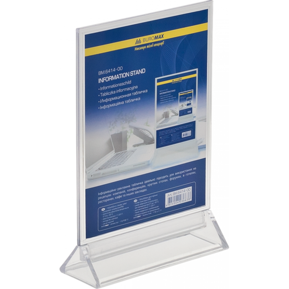 Інформаційні та іменні таблички широко використовуються для організації рекламно-інформаційної підтримки. Іменні таблички Buromax - ідеальний помічник під час проведень конференцій, семінарів, презентацій, круглих столів. Також, застосовуються в ресторанах і кафе для демонстрації спеціальних меню, «гарячих пропозицій»; в готелях і офісах - для позначення столика рецепції і адміністратора. Поліграфічні вкладиші легко міняються, а прозорий полістирол, з якого виготовлені таблички Buromax, не спотворює передачу кольору і чіткість зображень. Для різних цілей є різні розміри табличок. Двосторонні таблички. Розмір 150х200 мм.